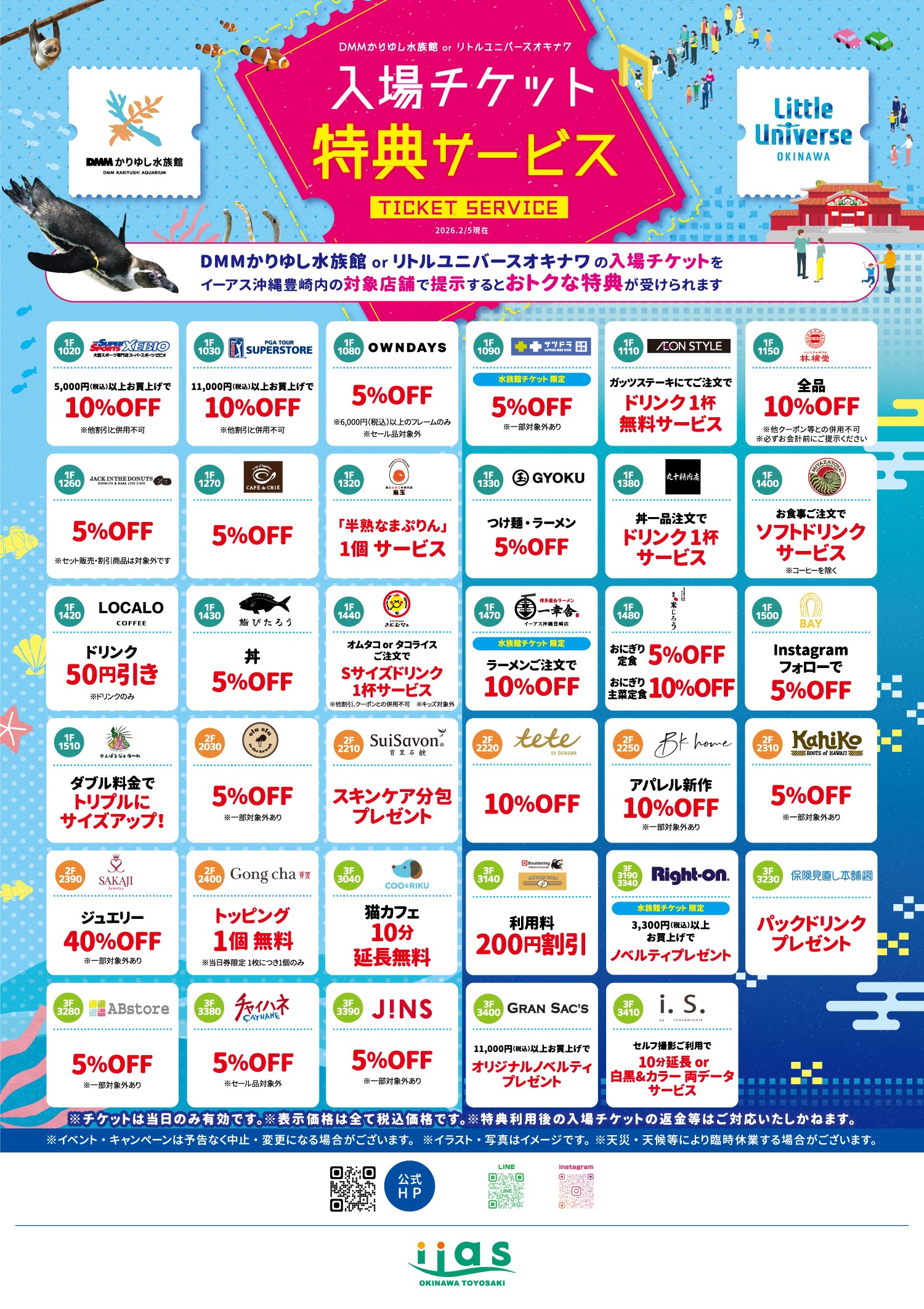 入場チケット特典サービス(DMMかりゆし水族館orリトルユニバース DMMかりゆし水族館&Little Universe OKINAWA入場者限定特典 入場チケットを掲示いただくと素敵な特典が受けられます