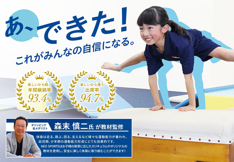 キッズ体操教室「NEO SPORTS KIDS沖縄豊崎校」は、マット、跳び箱、鉄棒、トランポリンなど