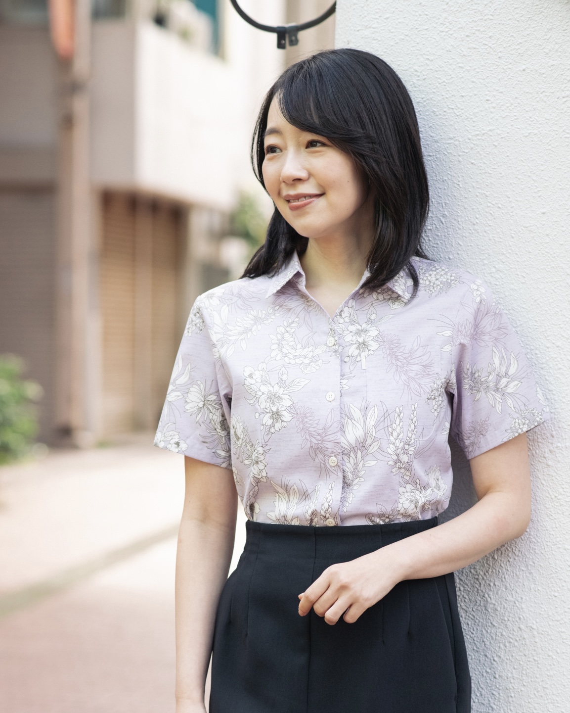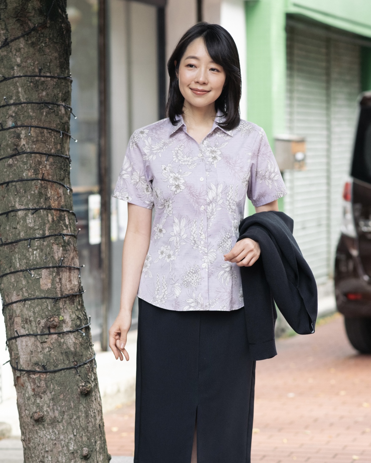 顔周りがすっきり見えるスキッパー襟とダーツの入った女性らしいシルエットで、